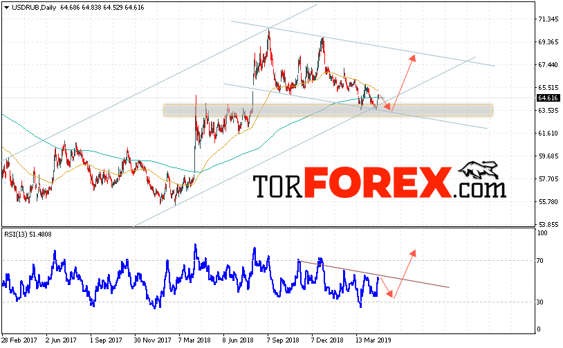 Валютная пара Доллар Рубль USD/RUB завершает торговую неделю вблизи уровня 64.61 Рублей за Доллар США. Пара продолжает движение в рамках нисходящего канала. Скользящие средние указывают на наличие восходящей тенденции. На текущей торговой неделе 29 апреля — 3 мая 2019 стоит ожидать продолжения снижения и тест области поддержки вблизи уровня 63.45. Откуда стоит ожидать отскок и продолжение роста курса Доллара выше уровня 67.55.