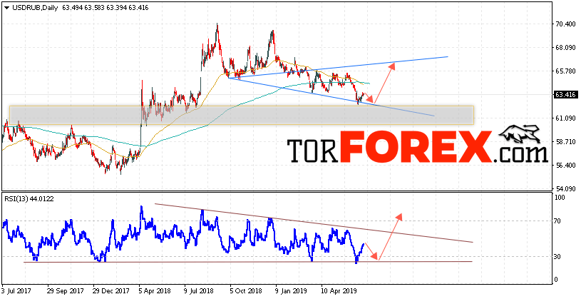 Таким образом, USD/RUB прогноз Доллара на неделю 8 — 12 июля 2019 предполагает попытку теста области поддержки вблизи уровня 62.95. Откуда стоит ожидать попытку роста Доллара в область выше уровня 66.35. Дополнительным сигналом станет отскок от линии поддержки на индикаторе относительной силы. Отменой варианта подъёма курса Доллара на текущей торговой неделе станет падение и пробой области 60.75. Что укажет на продолжение снижения пары.