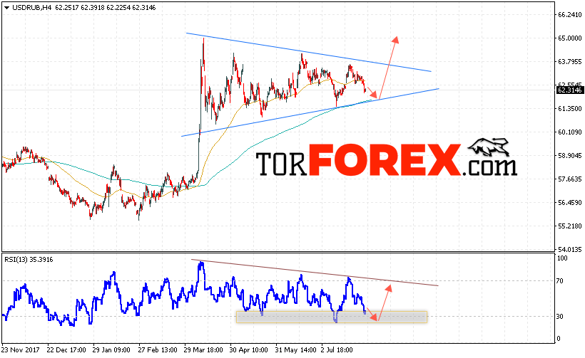 В пользу роста пары USD/RUB выступит тест области поддержки на индикаторе относительной силы. Отменой варианта роста пары USD/RUB на Форекс станет падение и пробой уровня 61.40 Рублей за Доллар, что укажет на пробой нижней границы модели «Треугольник» и продолжение падения пары Доллар Рубль в область ниже уровня 60.00. Подтверждением роста пары выступит пробой верхней границы модели «Треугольник» и закрытие выше уровня 64.00.