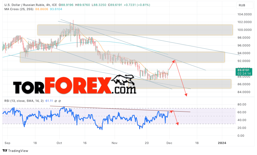 Валютная пара Доллар Рубль USD/RUB продолжает движение в рамках развития бычьей коррекции и медвежьего канала. В момент публикации прогноза курс Доллара США к Российскому Рублю составляет 89.61. Скользящие средние указывают на наличие краткосрочной медвежьей тенденции. Цены вновь тестируют область между сигнальными линиями, что указывает на давление со стороны продавцов американской валюты и потенциальное продолжение падения Доллара США против Российского Рубля. В рамках прогноза курса Доллара на 1 декабря 2023 стоит ожидать попытку развития бычьей коррекции цены и тест уровня сопротивления вблизи области 91.85 Рублей за Доллар США. Затем, отскок вниз и продолжение падения валютной пары в область ниже уровня 83.45.
