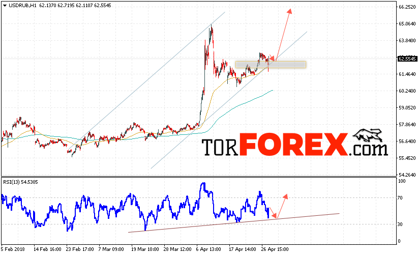 Таким образом, USD/RUB прогноз курса Доллара на 1 мая 2018 предполагает попытку теста уровня поддержки вблизи области 62.30, откуда стоит ожидать отскок и попытку продолжения роста курса Доллара против Рубля с целью выше уровня 65.50, дополнительным сигналом в пользу роста пары выступит тест линии тренда на индикаторе относительной силы.