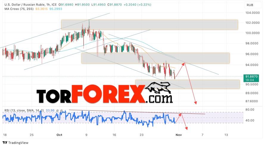 Дополнительным сигналом в пользу падения валютной пары USD/RUB 1 ноября 2023 выступит тест линии тренда на индикаторе относительной силы. Вторым сигналом станет отскок от верхней границы медвежьего канала. Отменой варианта падения пары USD/RUB на Форекс станет сильный рост котировок и пробой уровня 96.75 Рублей за Доллар. Это укажет на пробой области сопротивления и продолжение роста пары Доллар Рубль в область выше уровня 99.85. Подтверждением падению пары выступит пробой области поддержки и закрытие котировок актива под уровнем 89.75.