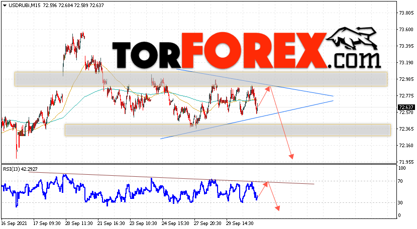 Валютная пара Доллар Рубль USD/RUB продолжает движение в рамках коррекции и формирования модели ”Треугольник”. В момент публикации прогноза курс Доллара США к Российскому Рублю составляет 72.63. Скользящие средние указывают на наличие краткосрочной медвежьей тенденции. Цены пробили область между сигнальными линиями вниз, что указывает на давление со стороны продавцов американской валюты и потенциальное продолжение падения Доллара США против Российского Рубля. В рамках прогноза курса Доллара на 1 октября 2021 стоит ожидать попытку развития роста цены и тест уровня сопротивления вблизи области 72.85 Рублей за Доллар США. Затем, отскок вниз и продолжение падения валютной пары в область ниже уровня 71.75.