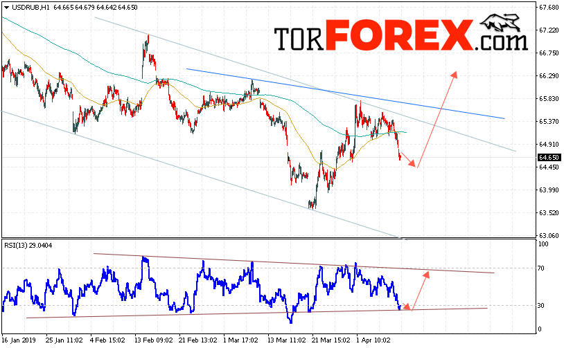 В пользу подъёма пары USD/RUB 10 апреля 2019 выступит тест линии поддержки на индикаторе относительной силы. Вторым сигналом станет завершение формирования перевернутой модели «Голова и плечи». Отменой варианта подъёма пары USD/RUB на Форекс станет падение и пробой уровня 63.55 Рублей за Доллар. Это укажет на пробой области поддержки и продолжение снижения пары Доллар Рубль в область ниже уровня 62.65. Подтверждением роста пары выступит пробой области сопротивления и закрытие выше уровня 65.85.