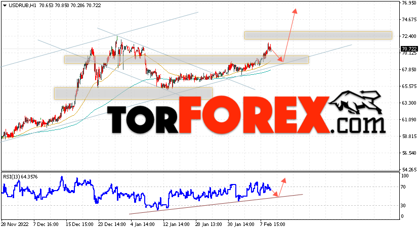 Валютная пара Доллар Рубль USD/RUB продолжает движение в рамках коррекции и бычьего канала. В момент публикации прогноза курс Доллара США к Российскому Рублю составляет 70.72. Скользящие средние указывают на наличие краткосрочной бычьей тенденции. Цены ушли вверх от области между сигнальными линиями, что указывает на давление со стороны покупателей американской валюты и потенциальное продолжение роста Доллара США против Российского Рубля. В рамках прогноза курса Доллара на 10 февраля 2023 стоит ожидать попытку развития коррекции цены и тест уровня поддержки вблизи области 68.25 Рублей за Доллар США. Затем, отскок вверх и продолжение роста валютной пары в область выше уровня 76.65.