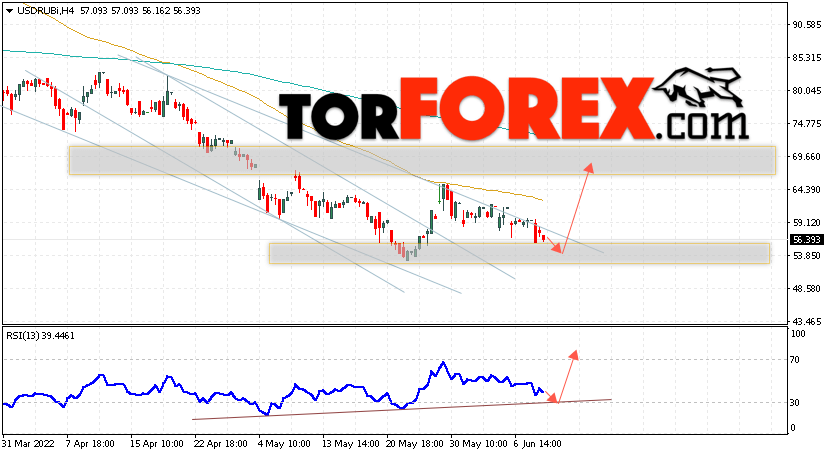 Дополнительным сигналом в пользу подъёма валютной пары USD/RUB 10 июня 2022 выступит тест бычьей линии тренда на индикаторе относительной силы. Вторым сигналом станет пробой верхней границы нисходящего канала. Отменой варианта роста пары USD/RUB на Форекс станет падение котировок и пробой уровня 50.45 Рублей за Доллар. Это укажет на пробой области поддержки и продолжение падения пары Доллар Рубль в область ниже уровня 46.55. Подтверждением подъёму пары выступит пробой области сопротивления и закрытие котировок актива над уровнем 63.55, что укажет на пробой верхней границы нисходящего канала.