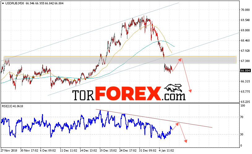 Таким образом, USD/RUB прогноз курса Доллара на 10 января 2019 предполагает попытку теста уровня сопротивления вблизи области 67.40. Откуда стоит ожидать отскок и продолжения падения курса Доллара против Рубля с целью выше уровня 65.75. Дополнительным сигналом в пользу снижения пары выступит тест линии тренда на индикаторе относительной силы. Отменой варианта снижения станет пробой области сопротивления и закрытие котировок выше уровня 68.10.