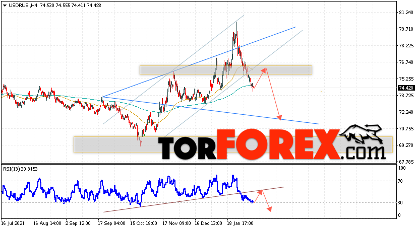 Дополнительным сигналом в пользу падения валютной пары USD/RUB 11 февраля 2022 выступит тест линии тренда на индикаторе относительной силы. Вторым сигналом станет отскок от нижней границы бычьего канала. Отменой варианта падения пары USD/RUB на Форекс станет сильный рост котировок и пробой уровня 77.55 Рублей за Доллар. Это укажет на пробой области сопротивления и продолжение роста пары Доллар Рубль в область выше уровня 80.55. Подтверждением падения пары выступит пробой области поддержки и закрытие котировок актива под уровнем 73.35.