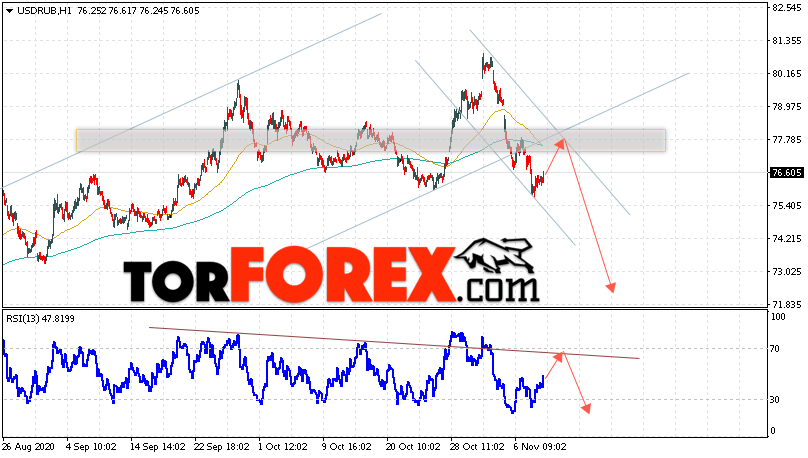Дополнительным сигналом в пользу падения валютной пары USD/RUB 11 ноября 2020 выступит тест линии сопротивления на индикаторе относительной силы. Вторым сигналом станет отскок от нижней границы восходящего канала. Отменой варианта падения пары USD/RUB на Форекс станет сильный рост и пробой уровня 79.65. Рублей за Доллар. Это укажет на пробой области сопротивления и продолжение роста пары Доллар Рубль в область выше уровня 82.45. Подтверждением падения пары выступит пробой области поддержки и закрытие котировок актива под уровнем 74.25.