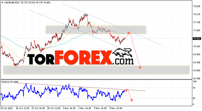 Валютная пара Доллар Рубль USD/RUB продолжает движение в рамках падения и медвежьего канала. В момент публикации прогноза курс Доллара США к Российскому Рублю составляет 70.80. Скользящие средние указывают на наличие краткосрочной медвежьей тенденции. Цены пробили область между сигнальными линиями вниз, что указывает на давление со стороны продавцов американской валюты и потенциальное продолжение падения Доллара США против Российского Рубля. В рамках прогноза курса Доллара на 11 ноября 2021 стоит ожидать попытку развития коррекции цены и тест уровня сопротивления вблизи области 71.15 Рублей за Доллар США. Затем, отскок вниз и продолжение падения валютной пары в область ниже уровня 69.05.