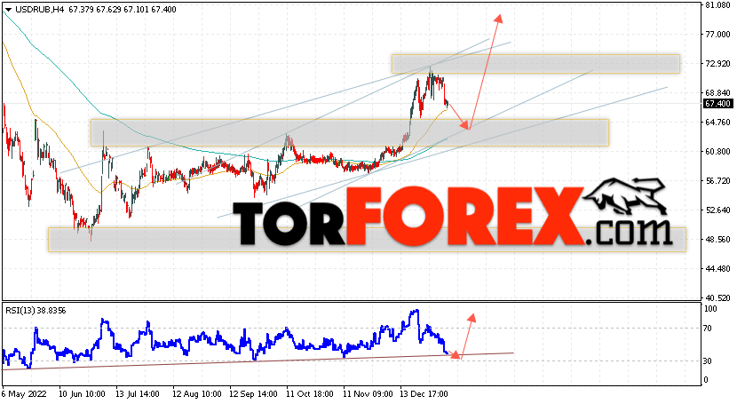 Дополнительным сигналом в пользу подъёма валютной пары USD/RUB 11 января 2023 выступит тест бычьей линии тренда на индикаторе относительной силы. Вторым сигналом станет отскок от нижней границы ”Треугольник”. Отменой варианта роста пары USD/RUB на Форекс станет падение котировок и пробой уровня 66.55 Рублей за Доллар. Это укажет на пробой области поддержки и продолжение падения пары Доллар Рубль в область ниже уровня 57.65. Подтверждением росту пары выступит пробой области сопротивления и закрытие котировок актива над уровнем 78.55, что укажет на пробой верхней границы модели ”Треугольник” и начало отработки паттерна с целями вверху.