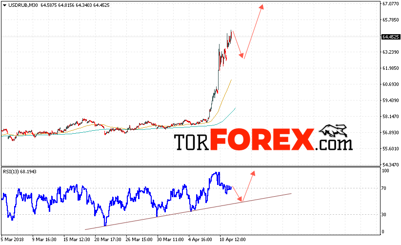 Таким образом, USD/RUB прогноз курса Доллара на 12 апреля 2018 предполагает попытку теста уровня поддержки вблизи области 63.20, откуда стоит ожидать отскок и попытку продолжения роста курса Доллара против Рубля с целью выше уровня 67.00, дополнительным сигналом в пользу роста пары выступит тест линии тренда на индикаторе относительной силы.