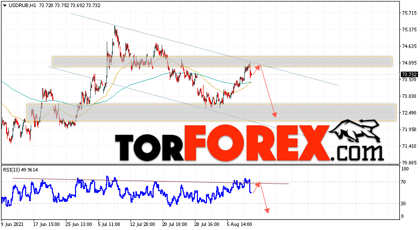 Дополнительным сигналом в пользу падения валютной пары USD/RUB 12 августа 2021 выступит тест линии тренда на индикаторе относительной силы. Вторым сигналом станет отскок от верхней границы медвежьего канала. Отменой варианта падения пары USD/RUB на Форекс станет сильный рост и пробой уровня 74.65. Рублей за Доллар. Это укажет на пробой области сопротивления и продолжение подъёма пары Доллар Рубль в область выше уровня 77.05. Подтверждением падения пары выступит пробой области поддержки и закрытие котировок актива под уровнем 73.45.
