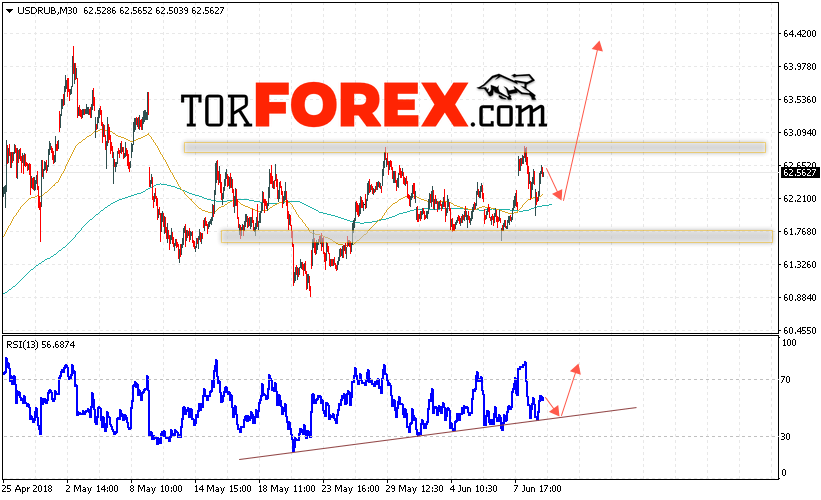 Таким образом, USD/RUB прогноз курса Доллара на 12 июня 2018 предполагает попытку теста уровня поддержки вблизи области 62.20, откуда стоит ожидать отскок и попытку продолжения роста курса Доллара против Рубля с целью выше уровня 64.00, дополнительным сигналом в пользу роста пары выступит тест восходящей линии тренда на индикаторе относительной силы.