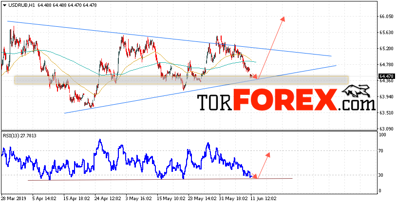 В пользу подъёма пары USD/RUB 12 июня 2019 выступит тест линии поддержки на индикаторе относительной силы. Вторым сигналом станет отскок от нижней границы модели «Треугольник». Отменой варианта подъёма пары USD/RUB на Форекс станет падение и пробой уровня 63.65 Рублей за Доллар. Это укажет на пробой области поддержки и продолжение снижения пары Доллар Рубль в область ниже уровня 62.25. Подтверждением роста пары выступит пробой верхней границы модели «Треугольник» и закрытие выше уровня 65.45.