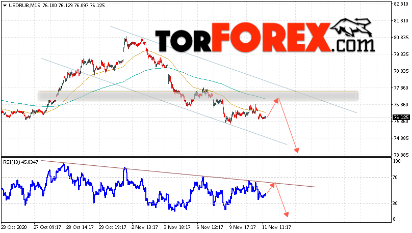 Дополнительным сигналом в пользу падения валютной пары USD/RUB 12 ноября 2020 выступит тест линии сопротивления на индикаторе относительной силы. Вторым сигналом станет отскок от верхней границы нисходящего канала. Отменой варианта падения пары USD/RUB на Форекс станет сильный рост и пробой уровня 79.05. Рублей за Доллар. Это укажет на пробой области сопротивления и продолжение роста пары Доллар Рубль в область выше уровня 81.65. Подтверждением падения пары выступит пробой области поддержки и закрытие котировок актива под уровнем 74.75.