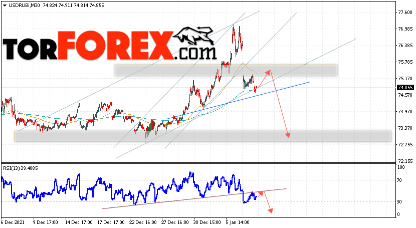 Дополнительным сигналом в пользу падения валютной пары USD/RUB 12 января 2022 выступит тест пробитой линии тренда на индикаторе относительной силы. Вторым сигналом станет отскок от нижней границы бычьего канала. Отменой варианта снижения пары USD/RUB на Форекс станет сильный рост котировок и пробой уровня 77.05 Рублей за Доллар. Это укажет на пробой области сопротивления и продолжение подъёма пары Доллар Рубль в область выше уровня 78.85. Подтверждением падению пары выступит пробой области поддержки и закрытие котировок актива под уровнем 74.05, что укажет на пробой нижней границы очередного бычьего канала, а также на заверением формирования разворотной модели ”Голова и плечи”.