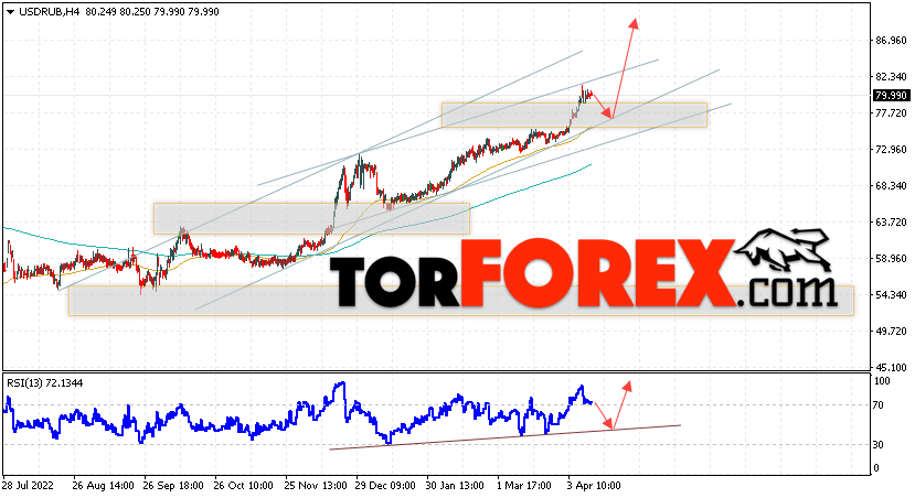 Валютная пара Доллар Рубль USD/RUB продолжает движение в рамках роста и бычьего канала. В момент публикации прогноза курс Доллара США к Российскому Рублю составляет 79.99. Скользящие средние указывают на наличие краткосрочной бычьей тенденции. Цены ушли вверх от области между сигнальными линиями, что указывает на давление со стороны покупателей американской валюты и потенциальное продолжение роста Доллара США против Российского Рубля. В рамках прогноза курса Доллара на 13 апреля 2023 стоит ожидать попытку развития коррекции цены и тест уровня поддержки вблизи области 77.65 Рублей за Доллар США. Затем, отскок вверх и продолжение роста валютной пары в область выше уровня 87.95.