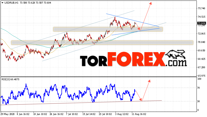 Валютная пара Доллар Рубль USD/RUB продолжает движение в рамках коррекции и восходящего канала. В момент публикации прогноза курс Доллара США к Российскому Рублю составляет 73.60. Скользящие средние указывают на наличие краткосрочной бычьей тенденции. Цены ушли от области между сигнальными линиями вверх, что указывает на давление со стороны покупателей американской валюты и потенциальное продолжение роста. В рамках прогноза курса Доллара на 13 августа 2020 стоит ожидать попытку развития снижения и тест уровня поддержки вблизи области 72.35 Рублей за Доллар США. Затем, отскок и продолжение роста валютной пары в область выше уровня 76.55.
