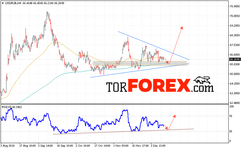 Таким образом, USD/RUB прогноз курса Доллара на 13 декабря 2018 предполагает попытку теста уровня поддержки вблизи области 65.85. Откуда стоит ожидать отскок и продолжения роста курса Доллара против Рубля с целью выше уровня 69.20. Дополнительным сигналом в пользу роста пары выступит тест линии тренда на индикаторе относительной силы. Отменой варианта подъёма станет пробой области поддержки и закрытие котировок ниже уровня 65.20.