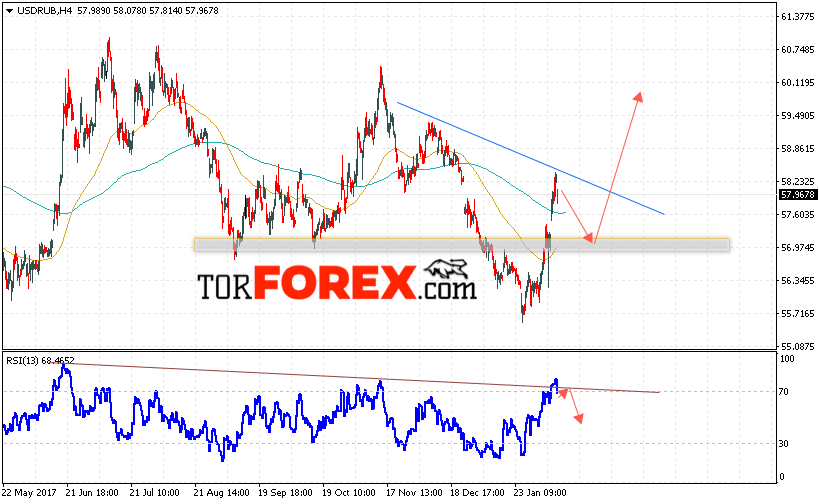 Таким образом, USD/RUB прогноз курса Доллара на 13 февраля 2018 предполагает попытку теста уровня поддержки вблизи области 57.00, откуда стоит ожидать отскок и попытку продолжения роста курса Доллара против Рубля с целью выше уровня 60.00, дополнительным сигналом в пользу снижения с текущих уровней выступит тест линии сопротивления на индикаторе относительной силы.