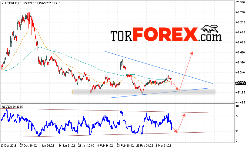 В пользу подъёма пары USD/RUB выступит тест линии поддержки на индикаторе относительной силы. Вторым сигналом станет отскок от нижней границы модели «Треугольник». Отменой варианта роста пары USD/RUB на Форекс станет падение и пробой уровня 64.75 Рублей за Доллар. Это укажет на пробой области поддержки и продолжение падения пары Доллар Рубль в область ниже уровня 63.65. Подтверждением роста пары выступит пробой области сопротивления и закрытие выше уровня 66.45.