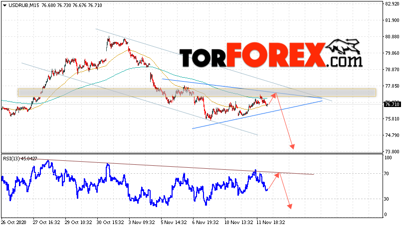 Дополнительным сигналом в пользу падения валютной пары USD/RUB 13 ноября 2020 выступит тест линии сопротивления на индикаторе относительной силы. Вторым сигналом станет отскок от верхней границы нисходящего канала. Отменой варианта падения пары USD/RUB на Форекс станет сильный рост и пробой уровня 78.75. Рублей за Доллар. Это укажет на пробой области сопротивления и продолжение роста пары Доллар Рубль в область выше уровня 81.75. Подтверждением падения пары выступит пробой области поддержки и закрытие котировок актива под уровнем 75.05.
