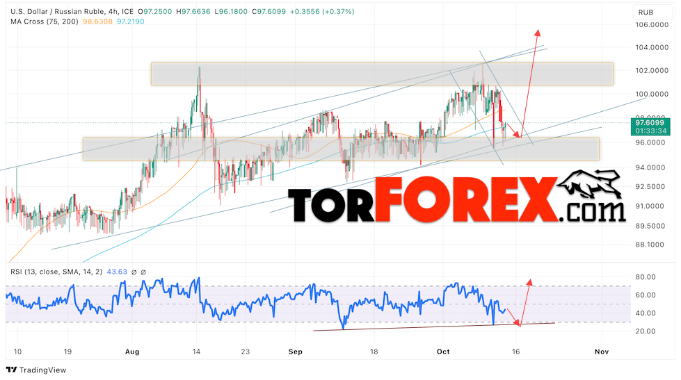 Дополнительным сигналом в пользу подъёма валютной пары USD/RUB 13 октября 2023 выступит тест линии тренда на индикаторе относительной силы. Вторым сигналом станет отскок от нижней границы бычьего канала. Отменой варианта роста пары USD/RUB на Форекс станет падение котировок и пробой уровня 94.05 Рублей за Доллар. Это укажет на пробой области поддержки и продолжение падения пары Доллар Рубль в область ниже уровня 90.65. Подтверждением росту пары выступит пробой области сопротивления и закрытие котировок актива над уровнем 100.05, что укажет на пробой верхней границы нисходящего канала коррекции.