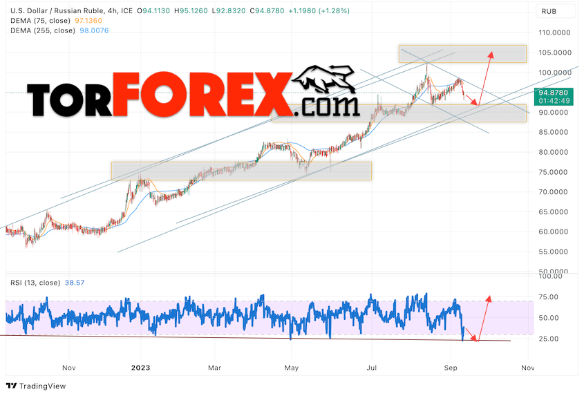 Валютная пара Доллар Рубль USD/RUB продолжает движение в рамках медвежьей коррекции и бычьего канала. В момент публикации прогноза курс Доллара США к Российскому Рублю составляет 94.87. Скользящие средние указывают на наличие краткосрочной бычьей тенденции. Цены пробили область между сигнальными линиями вверх, что указывает на давление со стороны покупателей американской валюты и потенциальное продолжение роста Доллара США против Российского Рубля. В рамках прогноза курса Доллара на 13 сентября 2023 стоит ожидать попытку развития коррекции цены и тест уровня поддержки вблизи области 95.65 Рублей за Доллар США. Затем, отскок вверх и продолжение роста валютной пары в область выше уровня 105.05.