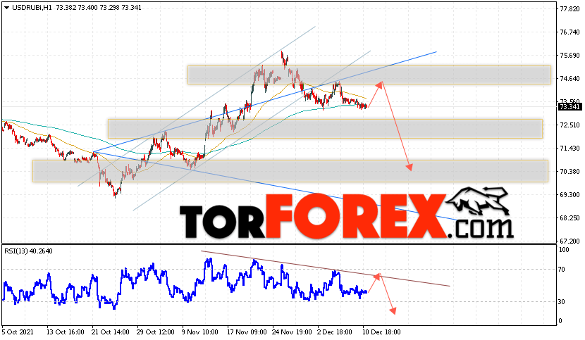 Дополнительным сигналом в пользу снижения валютной пары USD/RUB 14 декабря 2021 выступит тест нисходящей линии тренда на индикаторе относительной силы. Вторым сигналом станет отскок от нижней границы бычьего канала. Отменой варианта падения пары USD/RUB на Форекс станет сильный рост и пробой уровня 76.15 Рублей за Доллар. Это укажет на пробой области сопротивления и продолжение роста пары Доллар Рубль в область выше уровня 77.75. Подтверждением падения пары выступит пробой области поддержки и закрытие котировок актива под уровнем 72.35.