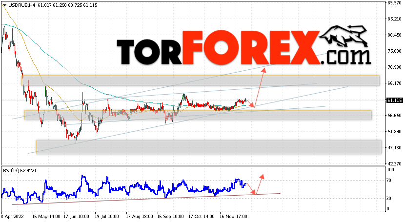 Валютная пара Доллар Рубль USD/RUB продолжает движение в рамках роста и бычьего канала. В момент публикации прогноза курс Доллара США к Российскому Рублю составляет 61.11. Скользящие средние указывают на наличие краткосрочной бычьей тенденции. Цены пробили область между сигнальными линиями вверх, что указывает на давление со стороны покупателей американской валюты и потенциальное продолжение роста Доллара США против Российского Рубля. В рамках прогноза курса Доллара на 14 декабря 2022 стоит ожидать попытку развития коррекции цены и тест уровня поддержки вблизи области 57.75 Рублей за Доллар США. Затем, отскок вверх и продолжение роста валютной пары в область выше уровня 70.95.