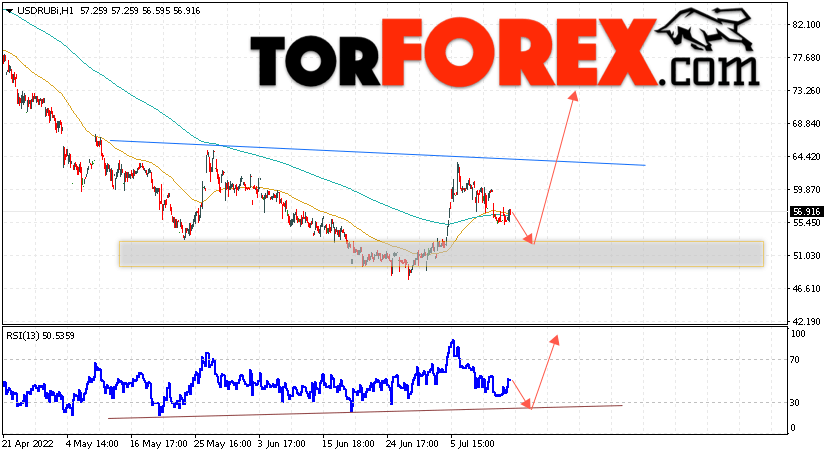 Дополнительным сигналом в пользу роста валютной пары USD/RUB 14 июля 2022 выступит тест линии тренда на индикаторе относительной силы. Вторым сигналом станет отскок от нижней границы разворотной модели перевёрнутая ”Голова и плечи”. Отменой варианта роста пары USD/RUB на Форекс станет падение котировок и пробой уровня 46.25 Рублей за Доллар. Это укажет на пробой области поддержки и продолжение падения пары Доллар Рубль в область ниже уровня 40.55. Подтверждением росту пары выступит пробой области сопротивления и закрытие котировок актива над уровнем 65.65, что укажет на пробой линии ”Шеи” разворотной модели и начало отработки паттерна с целями вверху.