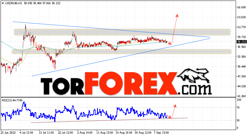 Валютная пара Доллар Рубль USD/RUB продолжает движение в рамках падения и формирования модели ”Треугольник”. В момент публикации прогноза курс Доллара США к Российскому Рублю составляет 58.13. Скользящие средние указывают на наличие краткосрочной бычьей тенденции. Цены пробили область между сигнальными линиями вверх, что указывает на давление со стороны покупателей американской валюты и потенциальное продолжение роста Доллара США против Российского Рубля. В рамках прогноза курса Доллара на 14 сентября 2022 стоит ожидать попытку развития коррекции цены и тест уровня поддержки вблизи области 56.85 Рублей за Доллар США. Затем, отскок вверх и продолжение подъёма валютной пары в область выше уровня 65.85.