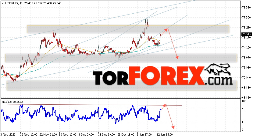 Дополнительным сигналом в пользу падения валютной пары USD/RUB 14 января 2022 выступит тест линии тренда на индикаторе относительной силы. Вторым сигналом станет отскок от нижней границы бычьего канала. Отменой варианта снижения пары USD/RUB на Форекс станет сильный рост котировок и пробой уровня 77.35 Рублей за Доллар. Это укажет на пробой области сопротивления и продолжение подъёма пары Доллар Рубль в область выше уровня 79.75. Подтверждением падению пары выступит пробой области поддержки и закрытие котировок актива под уровнем 74.05.