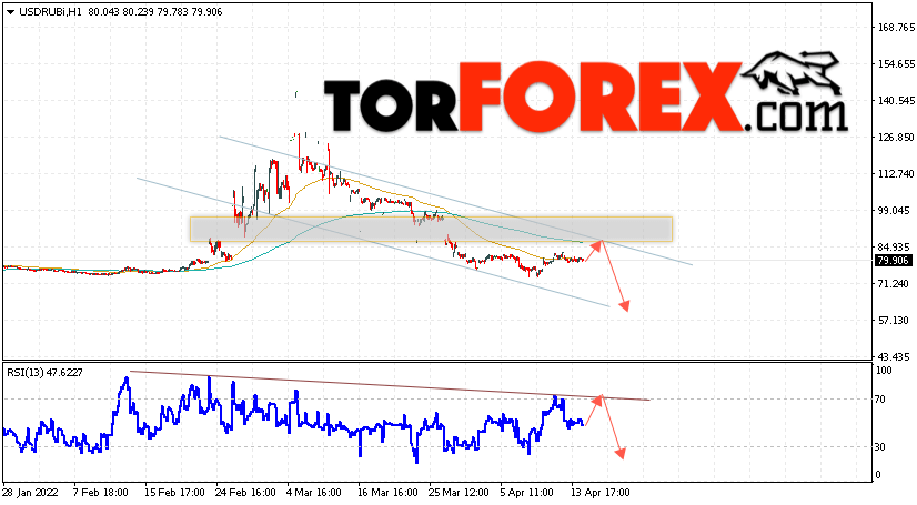 Дополнительным сигналом в пользу снижения валютной пары USD/RUB 15 апреля 2022 выступит тест линии тренда на индикаторе относительной силы. Вторым сигналом станет отток от верхней границы медвежьего канала. Отменой варианта падения пары USD/RUB на Форекс станет сильный рост котировок и пробой уровня 90.55 Рублей за Доллар. Это укажет на пробой области сопротивления и продолжение подъёма пары Доллар Рубль в область выше уровня 98.05. Подтверждением падению пары выступит пробой области поддержки и закрытие котировок актива под уровнем 72.55.