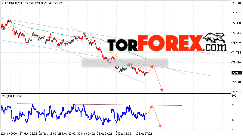 Дополнительным сигналом в пользу снижения валютной пары USD/RUB 15 декабря 2020 выступит тест линии сопротивления на индикаторе относительной силы. Вторым сигналом станет отскок от нижней границы нисходящего канала. Отменой варианта падения пары USD/RUB на Форекс станет сильный рост и пробой уровня 74.65. Рублей за Доллар. Это укажет на пробой области сопротивления и продолжение подъёма пары Доллар Рубль в область выше уровня 76.55. Подтверждением падения пары выступит пробой области поддержки и закрытие котировок актива под уровнем 72.25.