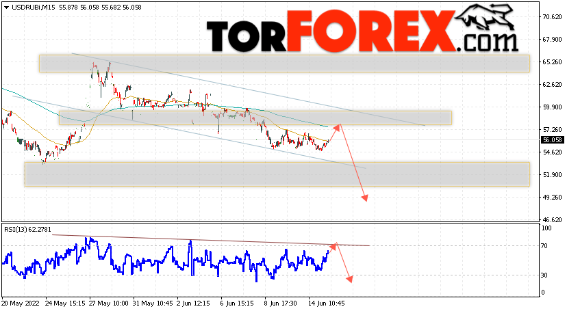 Дополнительным сигналом в пользу снижения валютной пары USD/RUB 15 июня 2022 выступит тест линии тренда на индикаторе относительной силы. Вторым сигналом станет отскок от верхней границы нисходящего канала. Отменой варианта падения пары USD/RUB на Форекс станет сильный рост котировок и пробой уровня 61.65 Рублей за Доллар. Это укажет на пробой области сопротивления и продолжение роста пары Доллар Рубль в область выше уровня 67.05. Подтверждением падению пары выступит пробой области поддержки и закрытие котировок актива под уровнем 51.45, что укажет на пробой нижней границы нисходящего канала.
