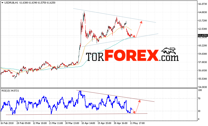 Таким образом, USD/RUB прогноз курса Доллара на 15 мая 2018 предполагает попытку теста уровня поддержки вблизи области 61.20, откуда стоит ожидать отскок и попытку продолжения роста курса Доллара против Рубля с целью выше уровня 63.80, дополнительным сигналом в пользу роста пары выступит тест линии тренда на индикаторе относительной силы.