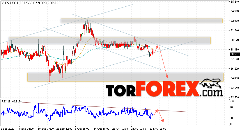 Дополнительным сигналом в пользу падения валютной пары USD/RUB 15 ноября 2022 выступит тест нисходящей линии тренда на индикаторе относительной силы. Вторым сигналом станет отскок от верхней границы медвежьего канала. Отменой варианта падения пары USD/RUB на Форекс станет сильный рост котировок и пробой уровня 61.05 Рублей за Доллар. Это укажет на пробой области сопротивления и продолжение роста пары Доллар Рубль в область выше уровня 63.25. Подтверждением падению пары выступит пробой области поддержки и закрытие котировок актива под уровнем 57.25, что укажет на пробой нижней границы бычьего канала коррекции.