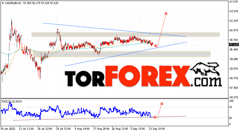 Дополнительным сигналом в пользу роста валютной пары USD/RUB 15 сентября 2022 выступит тест линии тренда на индикаторе относительной силы. Вторым сигналом станет отскок от нижней границы модели ”Треугольник”. Отменой варианта роста пары USD/RUB на Форекс станет падение котировок и пробой уровня 53.75 Рублей за Доллар. Это укажет на пробой области поддержки и продолжение падения пары Доллар Рубль в область ниже уровня 48.05. Подтверждением росту пары выступит пробой области сопротивления и закрытие котировок актива над уровнем 62.45, что укажет на пробой верхней границы модели и начало отработки паттерна с целями вверху.