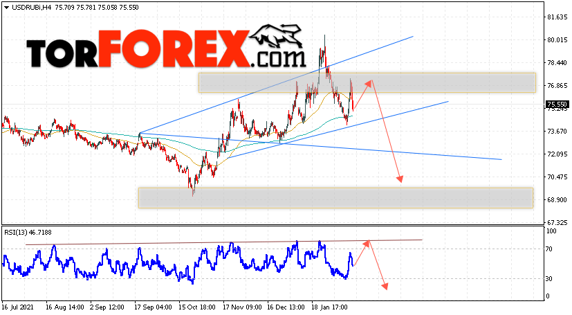 Дополнительным сигналом в пользу падения валютной пары USD/RUB 16 февраля 2022 выступит тест линии тренда на индикаторе относительной силы. Вторым сигналом станет отскок от верхней границы разворотной модели ”Голова и плечи”. Отменой варианта падения пары USD/RUB на Форекс станет сильный рост котировок и пробой уровня 80.35 Рублей за Доллар. Это укажет на пробой области сопротивления и продолжение роста пары Доллар Рубль в область выше уровня 82.25. Подтверждением падения пары выступит пробой области поддержки и закрытие котировок актива под уровнем 73.35 и начала отработки модели ”Голова и плечи”.