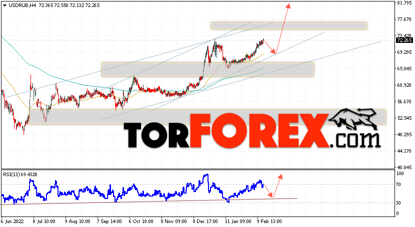 Дополнительным сигналом в пользу подъёма валютной пары USD/RUB 16 февраля 2023 выступит тест бычьей линии тренда на индикаторе относительной силы. Вторым сигналом станет отскок от нижней границы бычьего канала. Отменой варианта роста пары USD/RUB на Форекс станет падение котировок и пробой уровня 65.05 Рублей за Доллар. Это укажет на пробой области поддержки и продолжение падения пары Доллар Рубль в область ниже уровня 60.75. Подтверждением росту пары выступит пробой области сопротивления и закрытие котировок актива над уровнем 78.45, что укажет на пробой верхней границы бычьего канала, а это сигнал к росту на ширину канала.