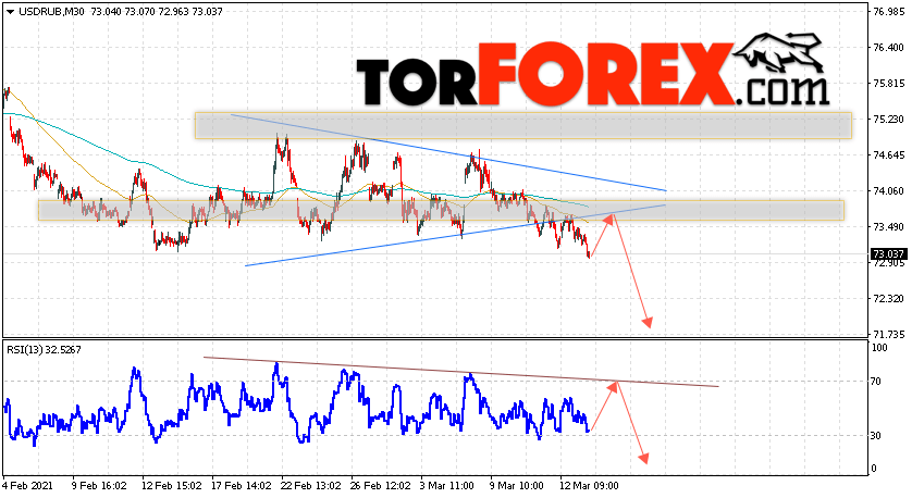 Дополнительным сигналом в пользу падения валютной пары USD/RUB 16 марта 2021 выступит тест линии сопротивления на индикаторе относительной силы. Вторым сигналом станет отскок от нижней границы модели ”Треугольник”. Отменой варианта падения пары USD/RUB на Форекс станет сильный рост и пробой уровня 74.95. Рублей за Доллар. Это укажет на пробой области сопротивления и продолжение роста пары Доллар Рубль в область выше уровня 78.85. Подтверждением падения пары выступит пробой области поддержки и закрытие котировок актива под уровнем 72.05.