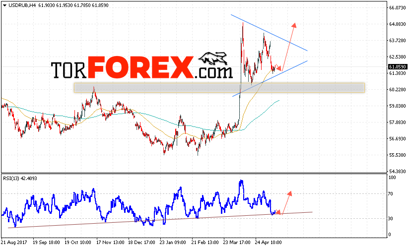 Валютная пара Доллар Рубль USD/RUB продолжает движение в рамках коррекции и формирования модели «Треугольник». На данный момент стоит ожидать попытку теста области поддержки вблизи уровня 61.40 и продолжения роста пары в область выше уровня 64.50.