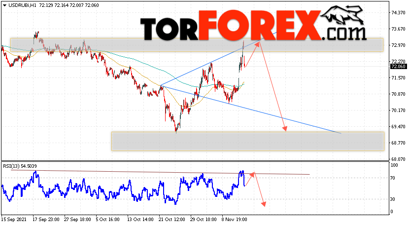 Дополнительным сигналом в пользу падения валютной пары USD/RUB 16 ноября 2021 выступит тест медвежьей линии тренда на индикаторе относительной силы. Вторым сигналом станет отскок от верхней границы модели ”Волна Вульфа”. Отменой варианта падения пары USD/RUB на Форекс станет сильный рост и пробой уровня 73.95. Рублей за Доллар. Это укажет на пробой области сопротивления и продолжение подъёма пары Доллар Рубль в область выше уровня 75.75. Подтверждением падения пары выступит пробой области поддержки и закрытие котировок актива под уровнем 71.45.