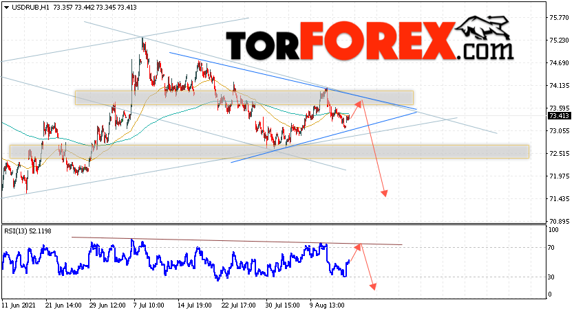 Таким образом, USD/RUB прогноз курса Доллара на 17 августа 2021 предполагает попытку теста уровня сопротивления вблизи области 73.65. Откуда стоит ожидать отскок и продолжения падения курса Доллара против Рубля с целью ниже уровня 71.45. Дополнительным сигналом в пользу снижения пары выступит тест линии тренда на индикаторе относительной силы. Отменой варианта падения станет пробой области сопротивления и закрытие котировок выше уровня 75.05. В таком случае стоит ожидать продолжения подъёма курса доллара США против российской валюты к уровню 77.05.