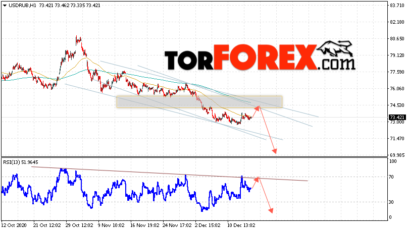 Дополнительным сигналом в пользу снижения валютной пары USD/RUB 17 декабря 2020 выступит тест линии сопротивления на индикаторе относительной силы. Вторым сигналом станет отскок от верхней границы нисходящего канала. Отменой варианта падения пары USD/RUB на Форекс станет сильный рост и пробой уровня 75.55. Рублей за Доллар. Это укажет на пробой области сопротивления и продолжение подъёма пары Доллар Рубль в область выше уровня 78.05. Подтверждением падения пары выступит пробой области поддержки и закрытие котировок актива под уровнем 71.55.