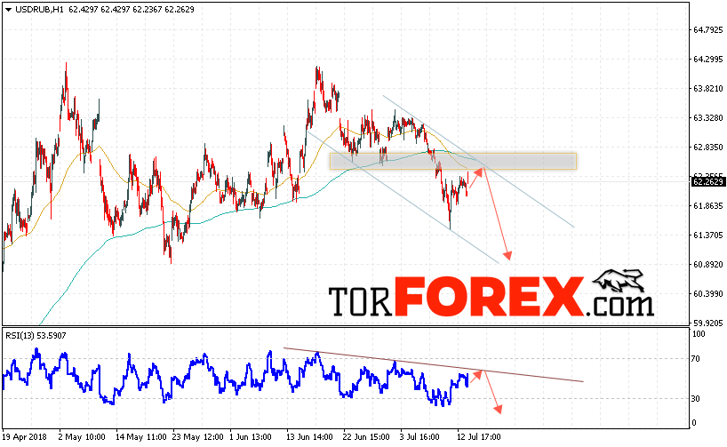 Таким образом, USD/RUB прогноз курса Доллара на 17 июля 2018 предполагает попытку теста уровня сопротивления вблизи области 62.45, откуда стоит ожидать отскок и попытку продолжения падения курса Доллара против Рубля с целью ниже уровня 60.80, дополнительным сигналом в пользу снижения пары выступит тест линии тренда на индикаторе относительной силы, отменой варианта роста станет пробой верхней границы нисходящего канала и закрытие котировок выше уровня 62.95.