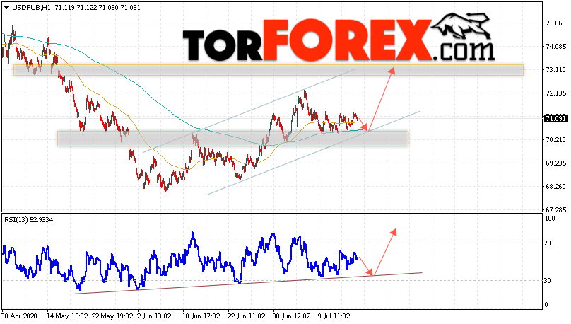 Дополнительным сигналом в пользу роста валютной пары USD/RUB 17 июля 2020 выступит тест линии поддержки на индикаторе относительной силы. Вторым сигналом станет отскок от нижней границы восходящего канала. Отменой варианта роста пары USD/RUB на Форекс станет падение и пробой уровня 69.35. Рублей за Доллар. Это укажет на пробой области поддержки и продолжение падения пары Доллар Рубль в область ниже уровня 66.55. Подтверждением роста пары выступит пробой области сопротивления и закрытие над уровнем 71.55.