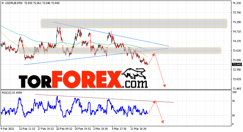 Валютная пара Доллар Рубль USD/RUB продолжает движение в рамках падения и начала отработки модели ”Треугольник”. В момент публикации прогноза курс Доллара США к Российскому Рублю составляет 72.84. Скользящие средние указывают на наличие краткосрочной медвежьей тенденции. Цены ушли вниз от области между сигнальными линиями, что указывает на давление со стороны продавцов американской валюты и потенциальное продолжение падения Доллара США против Российского Рубля. В рамках прогноза курса Доллара на 17 марта 2021 стоит ожидать попытку развития подъёма и тест уровня сопротивления вблизи области 73.25 Рублей за Доллар США. Затем, отскок и продолжение падения валютной пары в область ниже уровня 71.45.